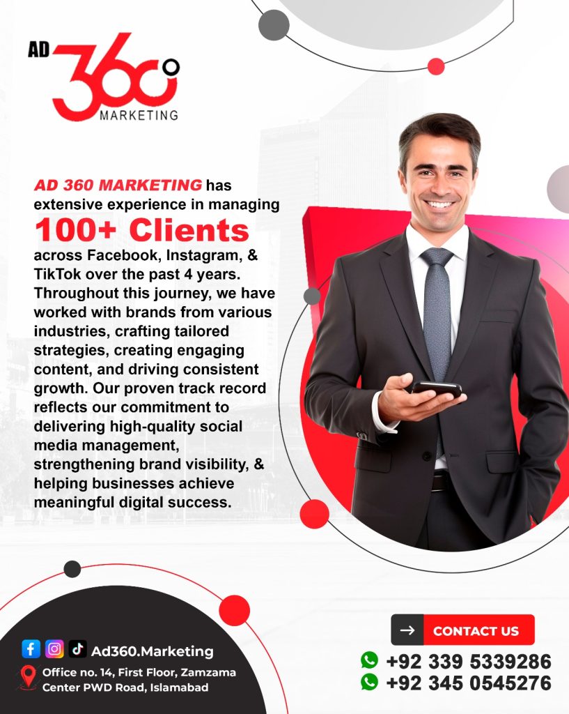 Ad 360 Marketing has extensive experience in managing 100+ clients across Facebook, Instagram, and TikTok over the past 4 years. Throughout this journey, we have worked with brands from various industries, crafting tailored strategies, creating engaging content, and driving consistent growth. Our proven track record reflects our commitment to delivering high-quality social media management, strengthening brand visibility, and helping businesses achieve meaningful digital success.